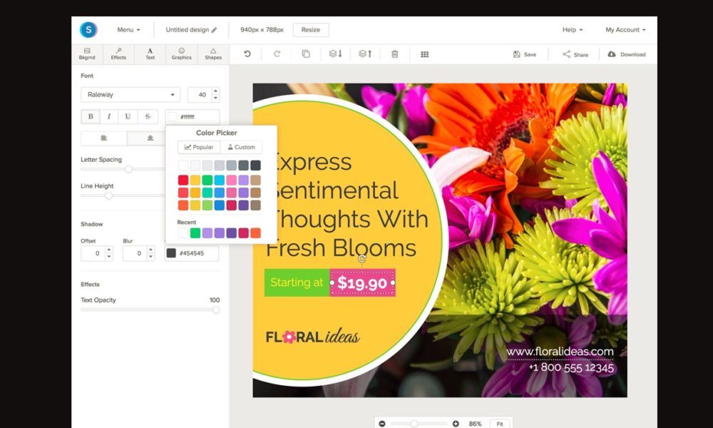Snappa provides you with a comprehensive library that contains free high resolution photos. Some of the critical features provided by Snappa include; quality templates, a graphic editor, importing your own custom fonts, uploading your graphics and photos, connecting to social media, and video tutorials. The graphical editor is powerful and provides you with an excellent platform for dragging and dropping objects to create engaging images in minutes. The graphic editor also enables you to add effects to your images.