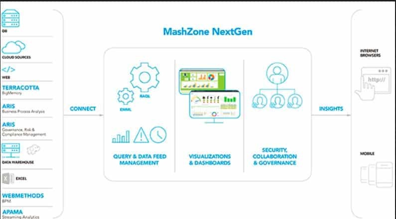 MashZone NextGen connects to different types of data sources, including JDBC-compliant data stores, streaming data from Apama, in-memory data from Terracotta BigMemory, ARIS tables, XML files, REST endpoints and web services, and Microsoft Excel spreadsheets. Typical usage includes: self-service analytics; in-memory analytics; operational intelligence; data visualization; situational awareness; and, self-service business intelligence.