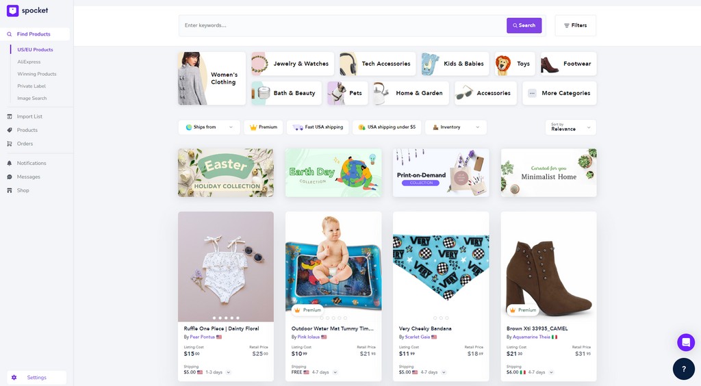 Spocket’s interface is typically organized around a few core areas: