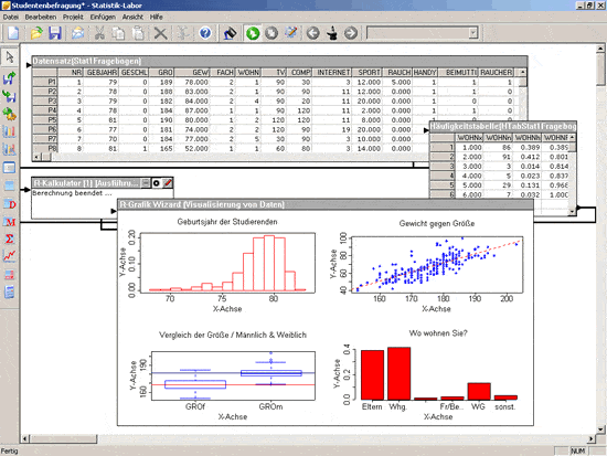 Standard graphs such as histograms, boxplots or scatterplots can easily be drawn using the 'R-Graph Wizard'. Depending on the desired complexity, individual variables can be graphed and provided with additional features such as measures of central tendency. R is completely available inside the Statistical Lab and can be accessed through the 'R-code Wizard'. This interface offers experts flexible possibilities for working on statistical problems. Teachers can easily create complex simulations and interactive experiments in R, that can normally only be programmed as Java-applets.