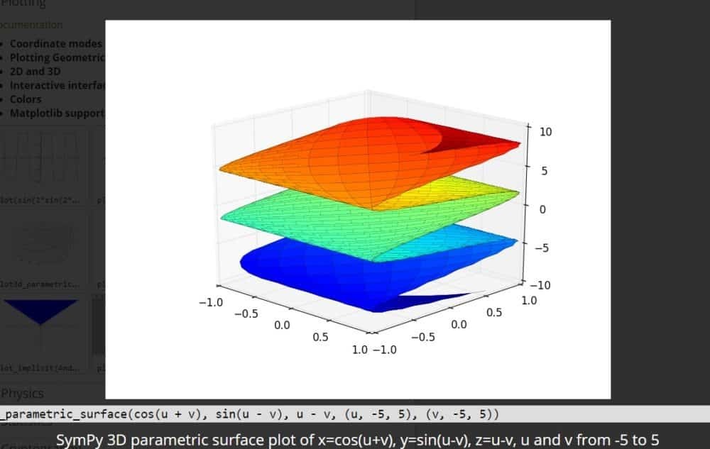SymPy includes features such as modules for plotting such as coordinate modes, Plotting Geometric Entities, 2D and 3D, Interactive interface, Colors and Matplotlib support, printing like 2D pretty printed output of math formulas, or LATEX, code generation, physics, statistics, combinatorics, number theory, geometry and logic, Conversion from Python objects to SymPy objects, Optional implicit multiplication and function application parsing, Limited Mathematica and Maxima parsing: example on SymPy Live and Custom parsing transformations and Shift cipher, Affine cipher, Bifid ciphers, Vigenere’s cipher, Substitution ciphers, Hill’s cipher, RSA, Kid RSA, Linear feedback shift registers and ElGamal encryption for cryptography.