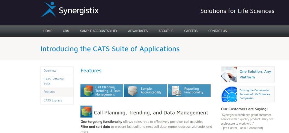 Synergistix’s Customer Analysis and Targeting System (CATS) platform and SaS marry the key components of SaaS – lower upfront costs, ease of configuration, rapid implementation, and instantaneous availability of new features and enhancements – with the technical support, asset and project management and data integration found in the traditional pharmaceutical CRM model.