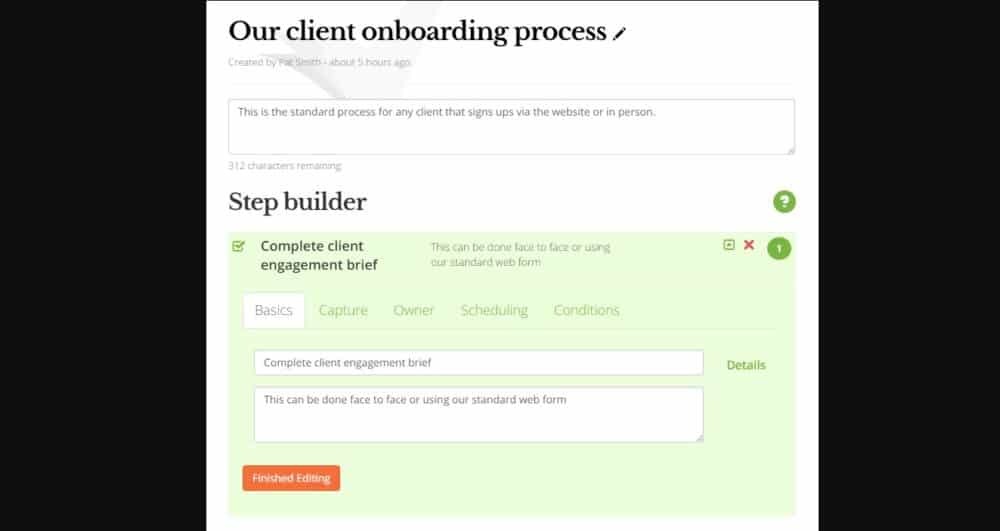 Tallyfy's business management module allows users to track multiple business processes and view their progress on a dashboard with real-time visibility of processes which helps users to ensure that they are continually improving and made more efficient. Tallyfy also has a process improvement module which allows users to create a user-friendly process template for processes where users can create steps for a process by defining data required in each step such as adding owners, managing their access and defining deadlines for the task.