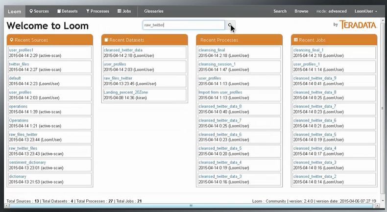 Teradata Loom enables data analysts and data scientists to easily find, access, and understand data in hadoop and quickly start with data analysis to accelerate the time from data acquisition to delivering business insights.