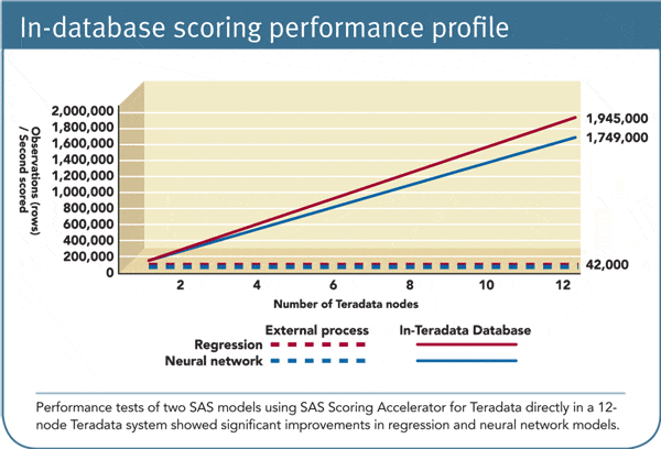 The Teradata Appliance for SAS delivers an integrated solution to dramatically increase the yield from current analytic modeling processes. This means that data-driven decisions can be made in seconds and minutes vs. hours and days. The appliance allows users to explore big data resources in finer detail, build complex data models and deliver strategic insights in a timely manner to mobile devices or dashboards.