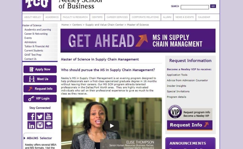 Neeley's Master of Science in Supply Chain Management is an evening program designed to help professionals earn a first-class specialized graduate degree in 16 months without leaving their careers. Our MS SCM program attracts talented professionals in the Dallas/Fort Worth area.