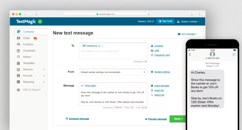The online sending of texts feature enables businesses to manage lists and import contacts all through their TextMagic account. It also enables them to send a text online to their customers and staff. TextMagic enables you to easily send texts from an email by simply converting your email into a text message and delivering it with all the replies. The SMS gateway API feature facilitates integration of the SMS gateway with your software or website using the SMS API tools and addition of text messaging to your business workflow.