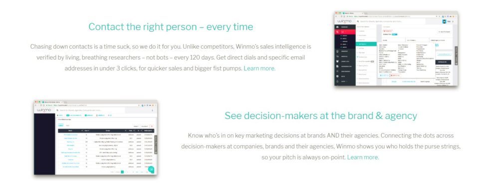 The Winmo feature provides you with a deeper mapping for brand, company, and agency to enable you have view full decision-maker sets. The Winmo feature provides you with an excellent platform for accessing real-time change alerts on target accounts and categories that you follow. The Winmo feature also provides you with a recommendation engine that suggests leads according to your activity and interests.
