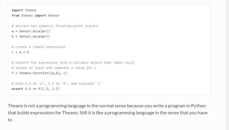 Theano is a Python library that lets users define, optimize, and evaluate mathematical expressions, especially ones with multi-dimensional arrays (numpy.ndarray). It is possible to attain speeds rivaling hand-crafted C implementations for problems involving large amounts of data using Theano. It can also surpass C on a CPU by many orders of magnitude by taking advantage of recent GPUs. Theano combines aspects of a computer algebra system (CAS) with aspects of an optimizing compiler. It can also generate customized C code for many mathematical operations. This combination of CAS with optimizing compilation is particularly useful for tasks in which complicated mathematical expressions are evaluated repeatedly and evaluation speed is critical. For situations where many different expressions are each evaluated once, Theano can minimize the amount of compilation/analysis overhead, but still provide symbolic features such as automatic differentiation. Theano’s compiler applies many optimizations of varying complexity to these symbolic expressions. Theano is not a programming language in the normal sense because users write a program in Python that builds expressions for Theano. It is good to think of theano.function as the interface to a compiler which builds a callable object from a purely symbolic graph. One of Theano’s most important features is that theano.function can optimize a graph and even compile some or all of it into native machine instructions. Theano focuses more on tensor expressions than Sympy, and has more machinery for compilation. If numpy is to be compared to MATLAB and sympy to Mathematica, Theano is a sort of hybrid of the two which tries to combine the best of both worlds.
