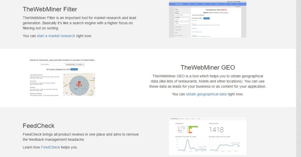 TheWebMiner GEO is a tool which helps you to obtain geographical data (like lists of restaurants, hotels and other locations). You can use these data as leads for your business or as content for your application.
