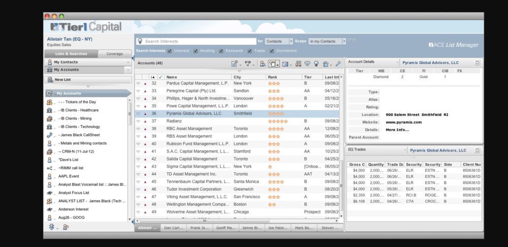 Tier1ACE for Sales & Trading product suite is an out-of-the-box Capital Markets solution that equips Sales, Trading and Research teams with essential tools to streamline their day – from prospecting, to managing lists and marketing analysts & companies.