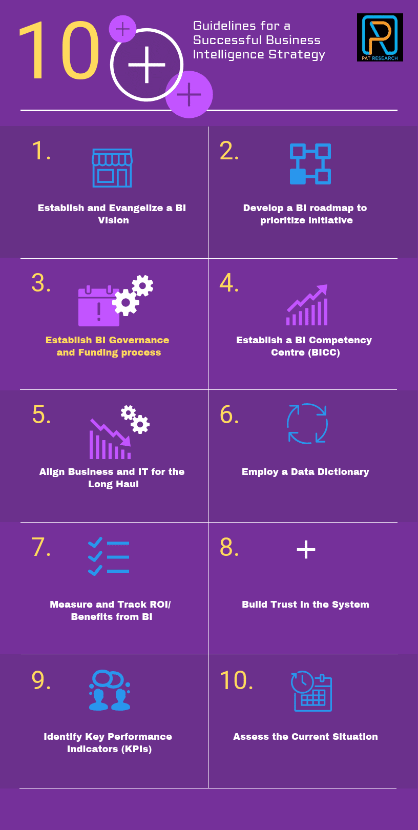 Business Intelligence Strategy is a roadmap that enables organizations to assess their current situation, measure their performance and seek out a roadmap for competitive advantages with process, solution and architecture. What are the Top Guidelines for a Successful Business Intelligence Strategy?
