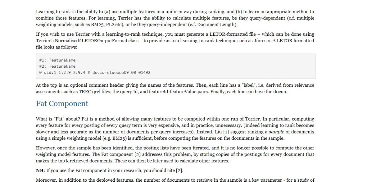 Terrier is a highly flexible, efficient, and effective open source search engine, readily deployable on large-scale collections of documents. Terrier implements state-of-the-art indexing and retrieval functionalities, and provides an ideal platform for the rapid development and evaluation of large-scale retrieval applications. Terrier is open source, and is a comprehensive, flexible and transparent platform for research and experimentation in text retrieval. Research can easily be carried out on standard TREC and CLEF test collections. Terrier is written in Java, and is developed at the School of Computing Science, University of Glasgow. Terrier can index large corpora of documents, and provides multiple…