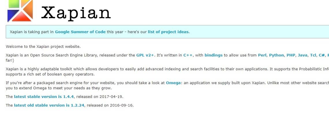 Xapian is an Open Source Search Engine Library, released under the GPL v2+. It's written in C++, with bindings to allow use from Perl, Python, PHP, Java, Tcl, C#, Ruby, Lua, Erlang, Node.js and R. Xapian is a highly adaptable toolkit which allows developers to easily add advanced indexing and search facilities to their own applications. It supports the Probabilistic Information Retrieval model and also supports a rich set of boolean query operators. If users are after a packaged search engine for their website, users should take a look at Omega: an application built upon Xapian. Unlike most other website…