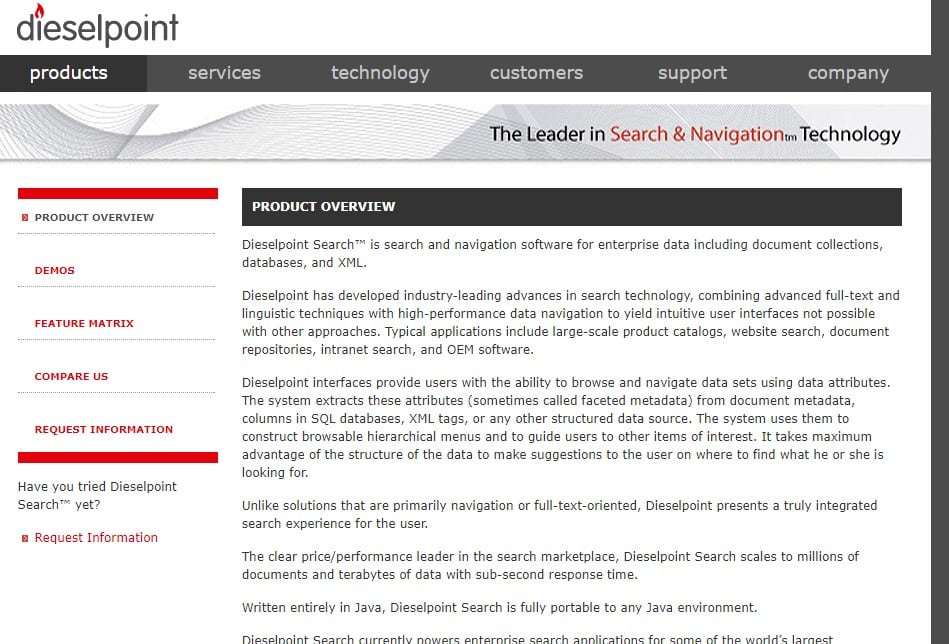 Dieselpoint Search is search and navigation software for enterprise data including document collections, databases, and XML. Dieselpoint has developed industry-leading advances in search technology, combining advanced full-text and linguistic techniques with high-performance data navigation to yield intuitive user interfaces not possible with other approaches. Typical applications include large-scale product catalogs, website search, document repositories, intranet search, and OEM software. Dieselpoint interfaces provide users with the ability to browse and navigate data sets using data attributes. The system extracts these attributes (sometimes called faceted metadata) from document metadata, columns in SQL databases, XML tags, or any other structured data source. The…
