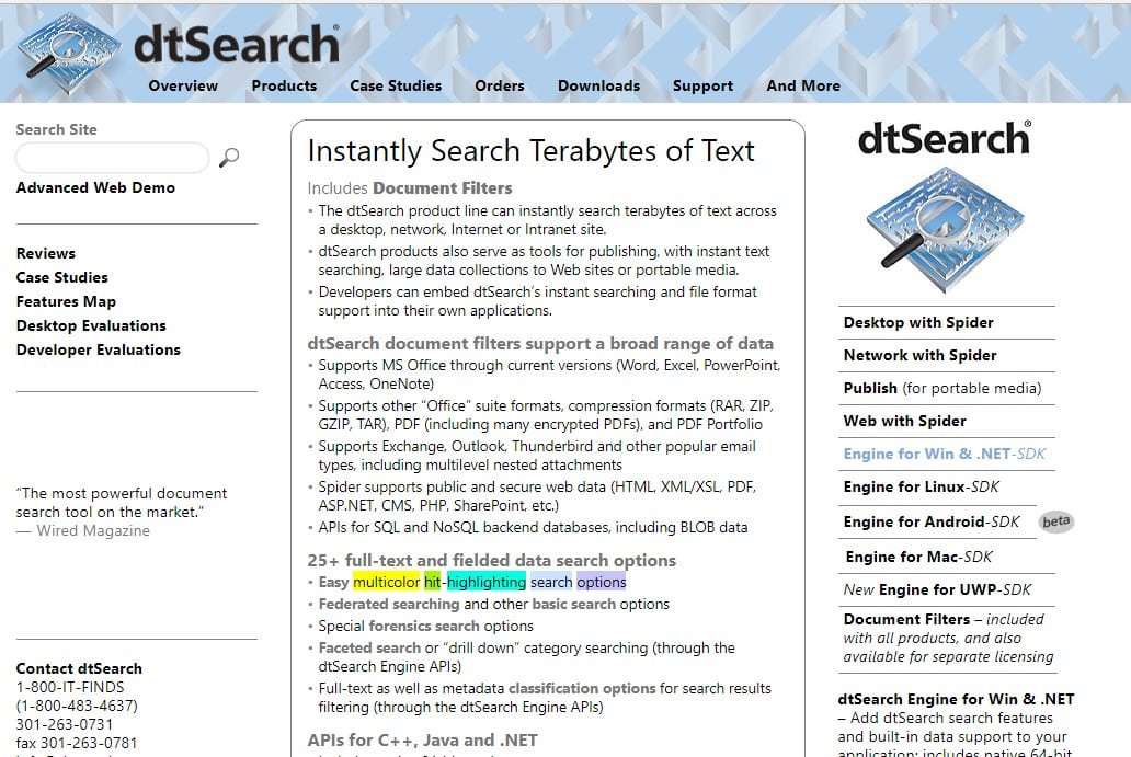 dtSearch products instant searching across terabytes of text in a wide range of online and offline data types. Search time (including concurrent search time) is typically less than a second. dtSearch products can instantly search terabytes of text because dtSearch builds a search index that stores each unique word and its location in the data. dtSearch can update users’ indexes by adding only new or updated items, removing deleted items, and compressing the index, without affecting searching. dtSearch’s document filters support popular file types, emails with multilevel attachments, databases, web data. dtSearch products can index terabytes of data spanning multiple…