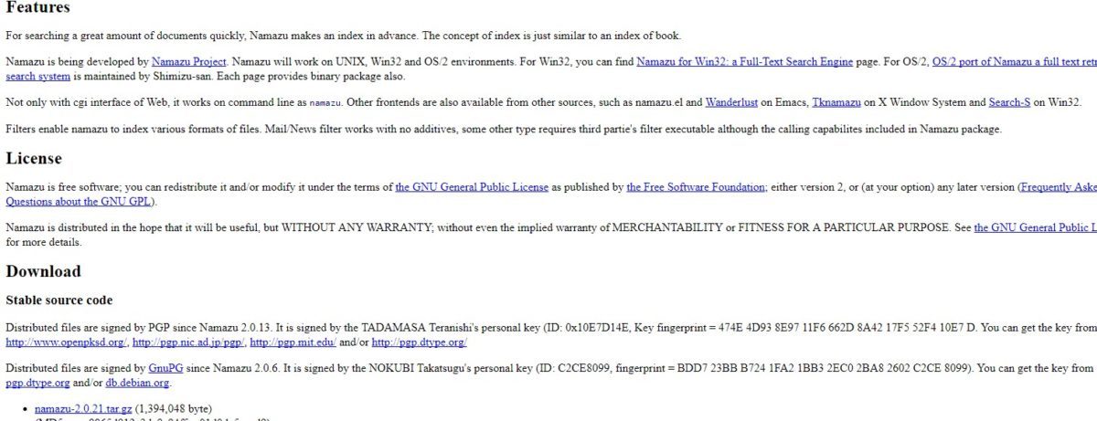 Namazu is a full-text search engine intended for easy use. Not only does it work as a small or medium scale Web search engine, but also as a personal search system for email or other files. Namazu is free software; users can redistribute it and/or modify it under the terms of the GNU General Public License as published by the Free Software Foundation; either version 2, or any later version. Namazu is distributed in the hope that it will be useful, but WITHOUT ANY WARRANTY; without even the implied warranty of MERCHANTABILITY or FITNESS FOR A PARTICULAR PURPOSE. See the…