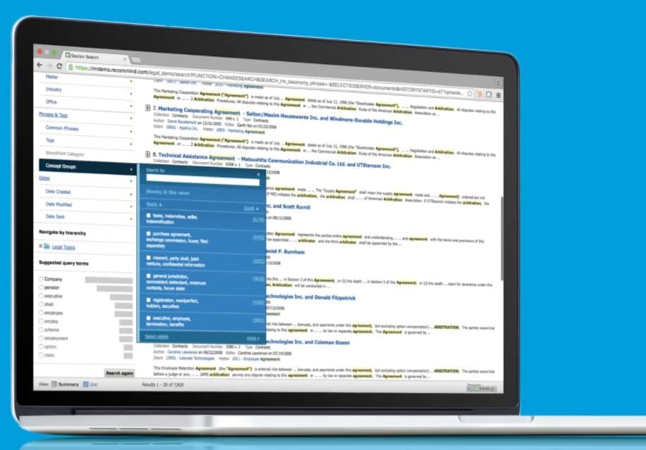 Recommind Decisiv is a unified concept search platform. Recommind Decisiv offers the following benefits; better results, fast search, and streamlined search. Recommind Decisiv utilizes a conceptualized search that identifies word associations in an entire database, meaning you can find the right documents without use of keywords. This enables it to return accurate search results. Its highly scalable architecture ensures it searches across billions of data in seconds. Recommind Decisiv uses visualizations like simplified charts to organize complicated search results. The charts can highlight a specific timeline and queries are represented according to prevalence. Recommind Decisiv utilizes phase analysis to deliver…
