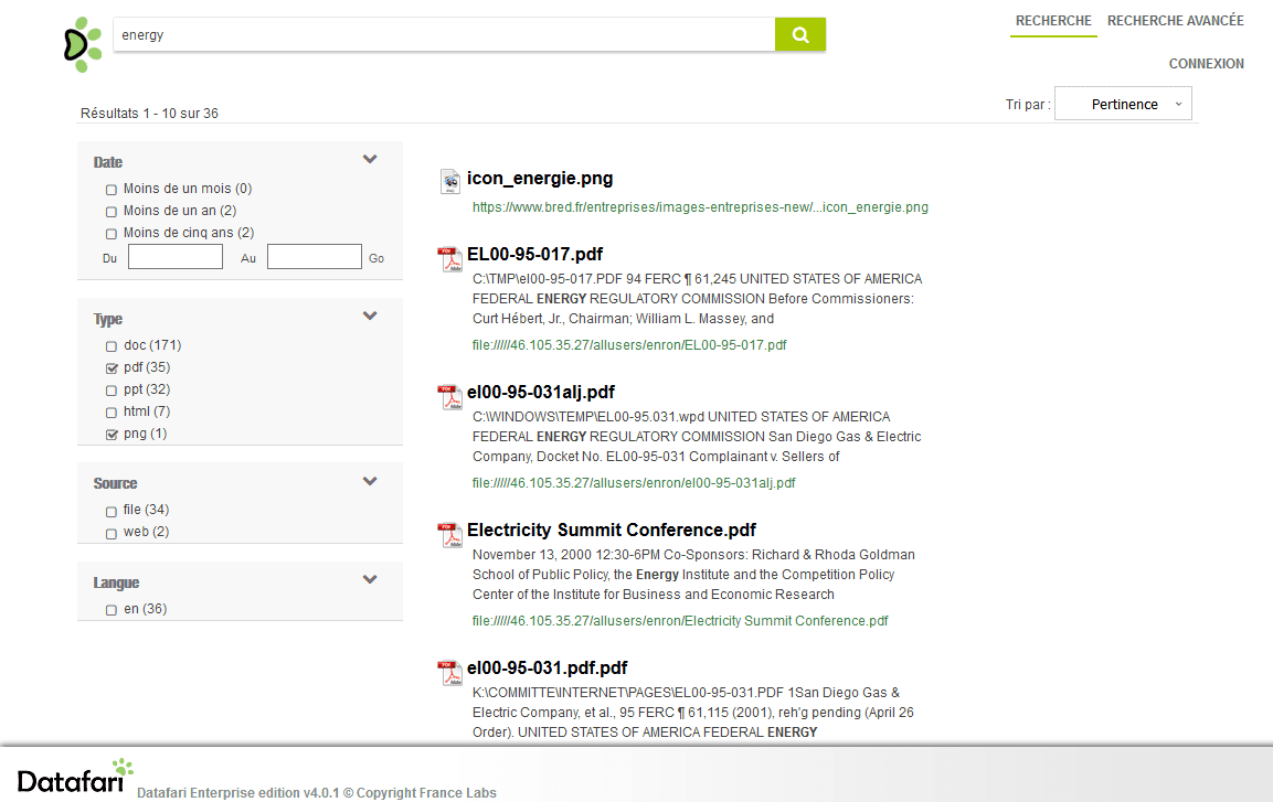 Datafari is an Enterprise Search solution, also known as an Insights Engine. It indexes data and documents wherever they are, whatever they are, securely. The aim is to be multisource and multiformat, to index both the metadata AND the contents, and to present the information through an easy-to-understand user interface. Datafari is able through an open source community Edition, and a production ready Enterprise Edition. Its big data capabilities allow it to scale to hundreds of millions of documents. Its analytics capabilities enable search experts to analyse search behaviors and to customise the search experience.