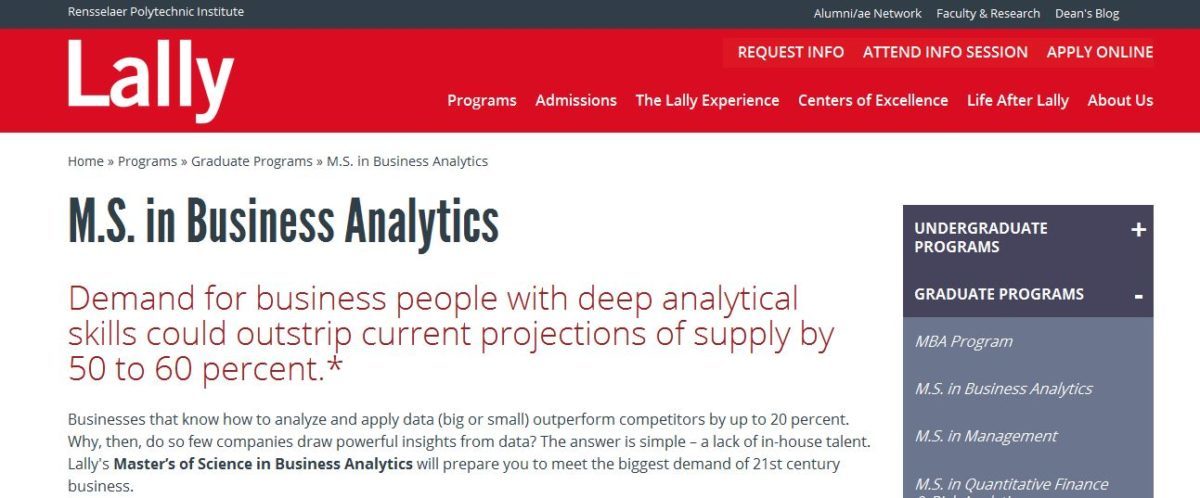 Lally's Master’s of Science in Business Analytics will prepare the students to meet the biggest demand of 21st century business. Its curriculum follows foundational business concepts with data management and statistical modeling, which students will customize with electives that include natural language processing, machine learning, marketing, and supply-chain management. Students will learn to think critically about data. They will have access to diverse data sets, powerful computing and visualization resources, and real-world applications possible only at Rensselaer. Lally offers a small class size, dedicated faculty, and hands-on experience through class projects, and a capstone course with industry partners. The experience…