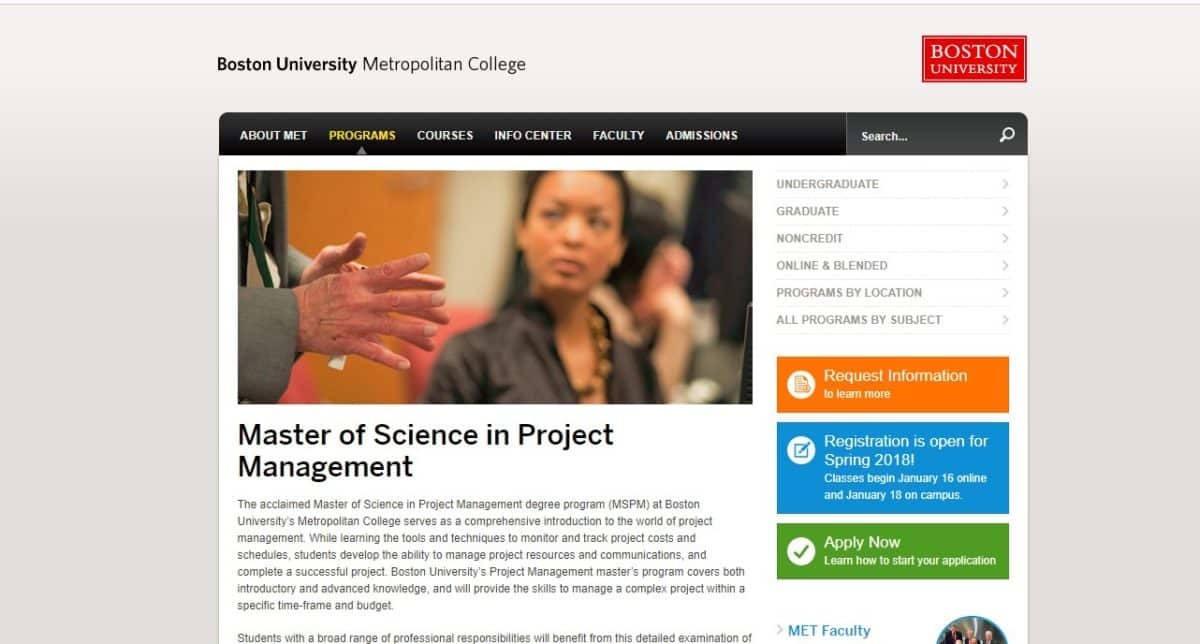 The Master of Science in Project Management degree program (MSPM) at Boston University’s Metropolitan College provides the fundamental and advanced Project Management knowledge and skills needed to manage a complex project within a specific time-frame and budget.