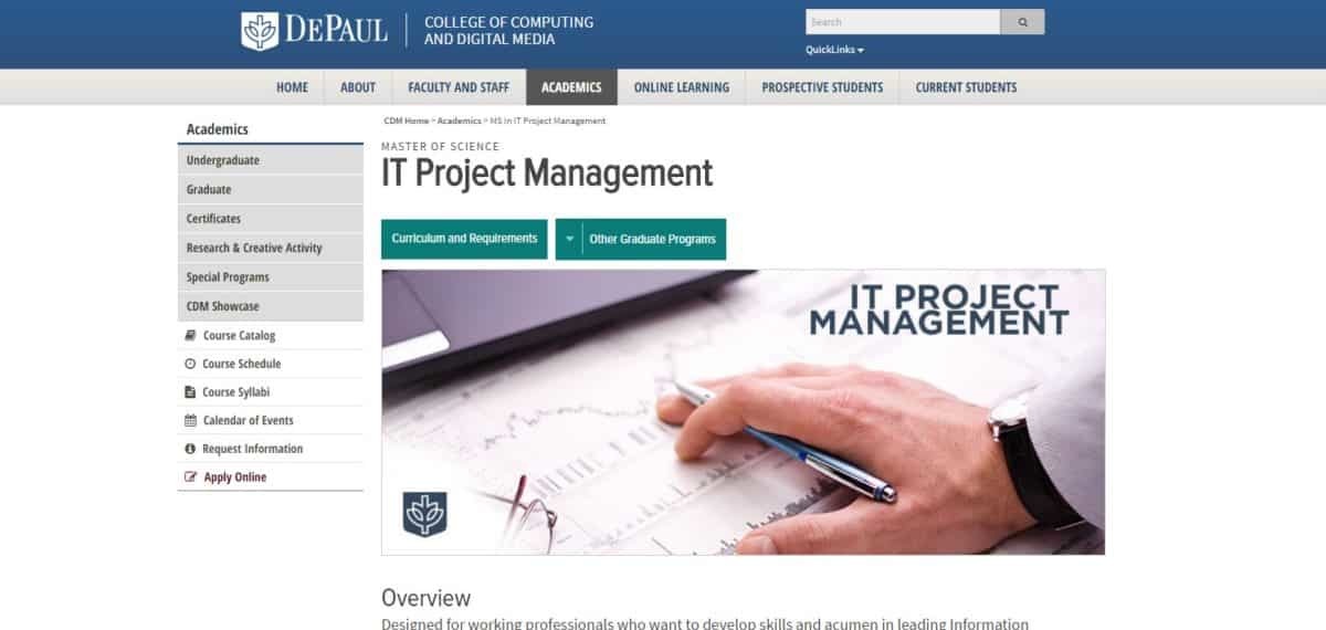 The DePaul University Master of Science in IT Project Management is designed for working professionals who want to learn the skills and develop the acumen necessary for a career in managing all aspects of Information Technology projects as well as the other larger programs.