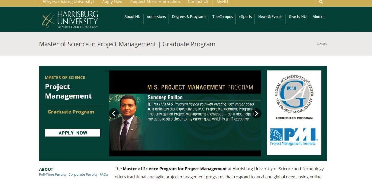 The Master of Science in Project Management degree offered at the Harrisburg University of Science and Technology provides students with the technical, project management and leadership skills needed to deliver high-quality projects on time, on-budget and to the defined specifications.