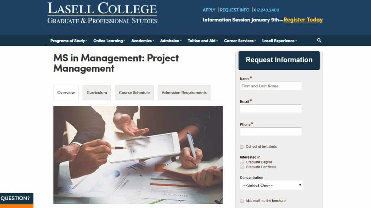 The Project Management degree at Lassell College is offered as a concentration in the Master of Science in Management program. Lasell’s Project Management concentration provides students with an understanding of today’s rapidly evolving economy and a growing emphasis on team-oriented, project-focused workplaces, giving them a solid advantage in an increasingly vital field. It instills in graduates the core skills required to create, define, and complete complex projects, including strong communication, business strategy, and organizational theory. Classes are capped at 23 students, ensuring a highly collaborative learning environment and committed faculty, who bring rich experience as working professionals to the classroom.…