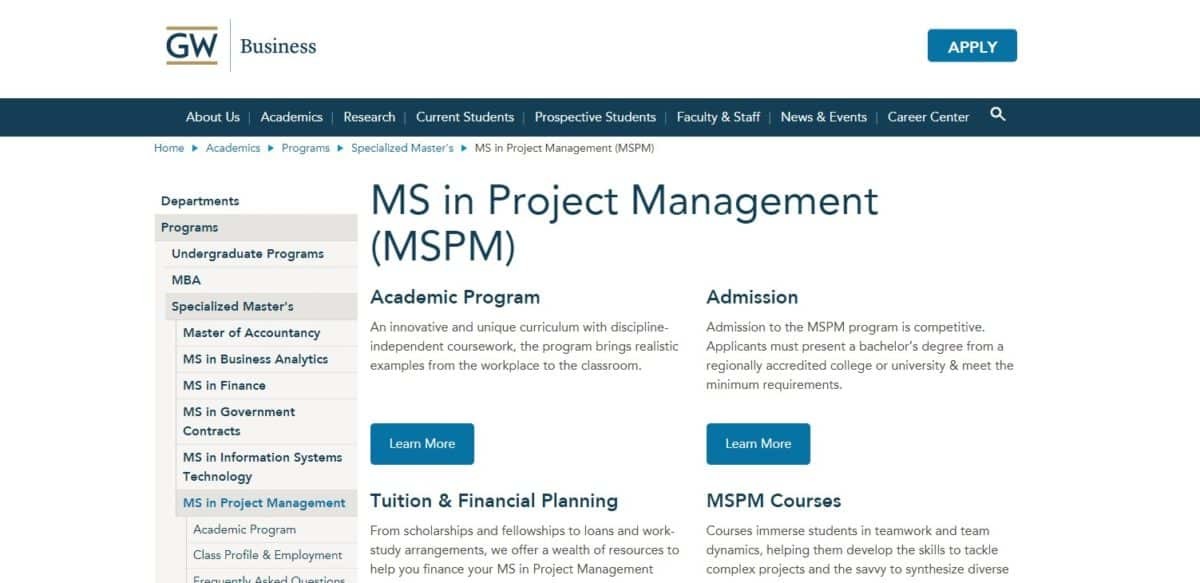 The George Washington School of Business’ Master of Science in Project Management is a highly specialized program applicable to all industries. Admission to the MSPM program is competitive. Applicants must present a bachelor’s degree from a regionally accredited college or university and also meet the minimum requirements. The MS in Project Management program aligns itself with the Project Management Institute’s PMBOK standards. Students will cover such topics as planning, scheduling, risk management, and cost estimation, and also learn project portfolio management and executive decision making. It is instructed by distinguished industry experts who bring realistic examples from the workplace to…