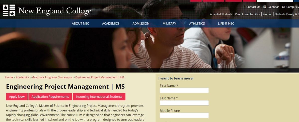 New England College’s Master of Science in Engineering Project Management provides engineering professionals with essential leadership and technical skills for today’s dynamic global environment. The program’s curriculum is designed so that engineers can leverage technical skills learned both in school and on the job. The program will transform you into a leader who can manage projects based upon your understanding of organizational dynamics, the process of managing people, strategic management, and financial and accounting skills. A Bachelor’s degree in Engineering is a pre-requisite when applying for admission. The 40-credit program can be completed in a year for those taking it…