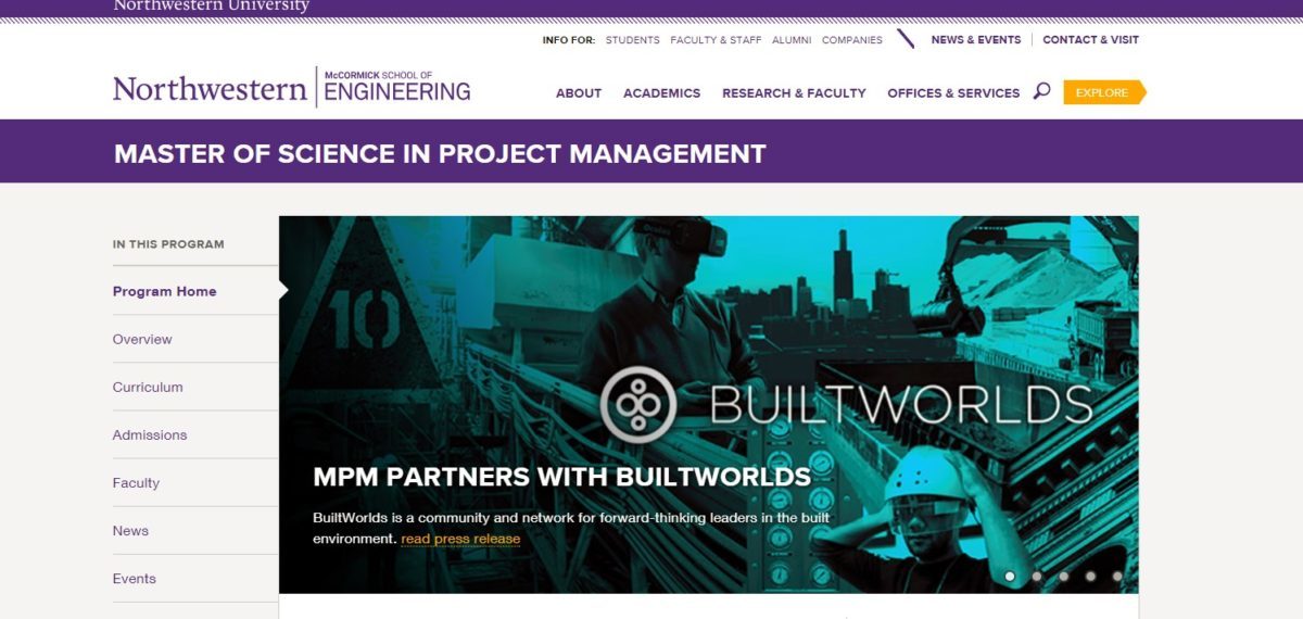 The Northwestern University Master of Project Management (MPM) program produces versatile and technically oriented professionals capable of directing major public and private infrastructure projects in today's increasingly complicated managerial environment.