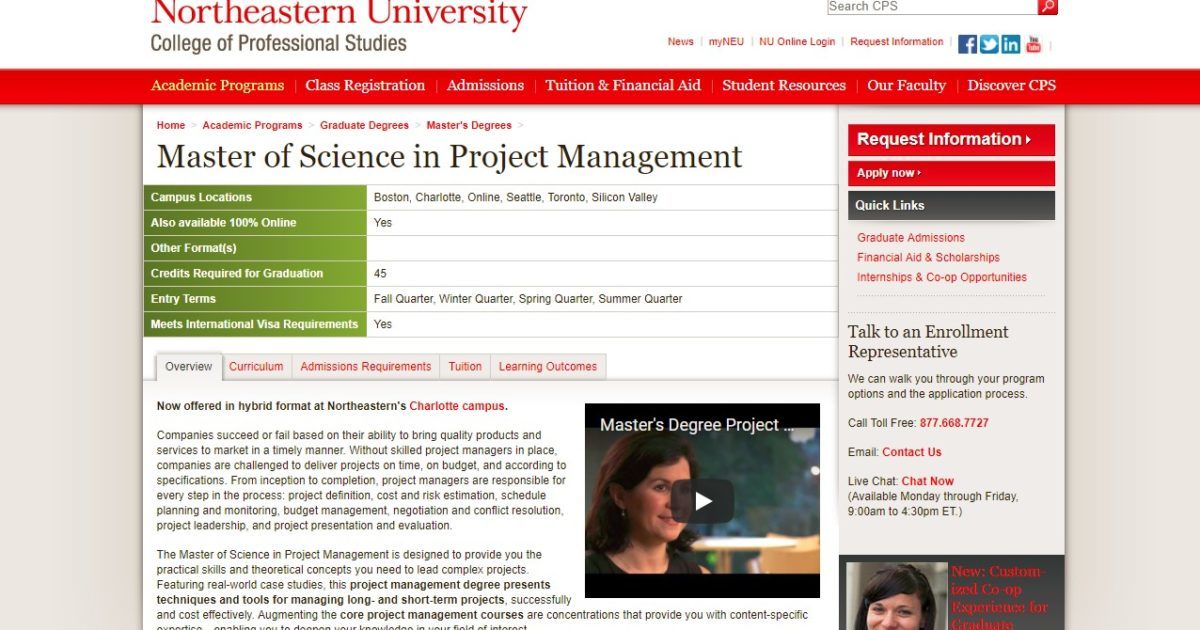 The Northeastern University’s Master of Science in Project Management is designed to help you obtain and learn the practical skills and theoretical concepts needed to lead and complete complex projects successfully and cost effectively.