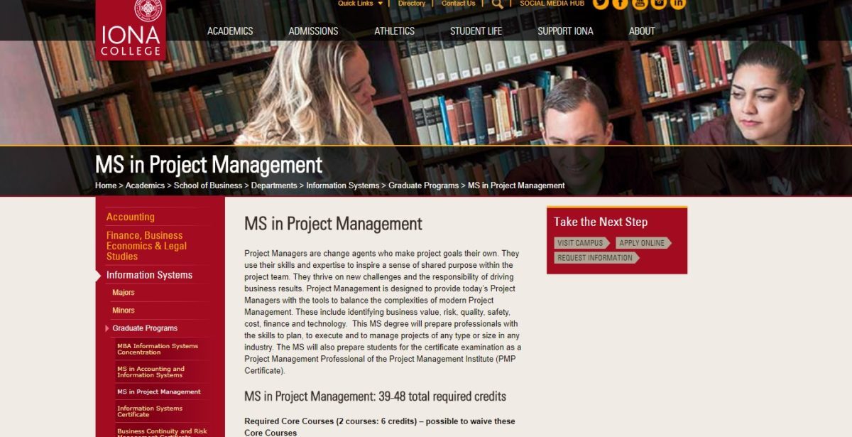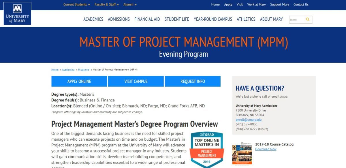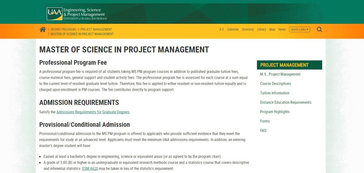 New York University, School of Professional Studies, MS in Project Management, Boston University Metropolitan College, Master of Science in Project Management, University of Connecticut, MS in Business Analytics and Project Management, George Washington School of Business,Master of Science in Project Management, University of California, Berkeley, Masters in Engineering and Project Management, Northeastern University, Master of Science in Project Management, University of Alaska Anchorage, MS in Project Management, Saint Mary’s University of Minnesota, Master of Science in Project Management, Davenport University, Master of Science in Technology Management, University of Michigan-Dearborn, Master of Science in Program and Project Management, Harrisburg University of Science and Technology, Master of Science in Project Management, DeVry University, Master’s in Project Management, The University of Texas at Dallas, Master of Science in Management Science (Project Management), Northwestern University, Robert R. McCormick School of Engineering, Master of Project Management, University of Houston, Master of Science in Technology Project Management, Iona College, Hagan School of Business, MS in Project Management, Lewis University, Master of Science in Project Management, Virginia International University, School of Business, Master of Science in Project Management, Regis University, Master of Science in Project Leadership and Management, Stevens Institute of Technology, Masters in Enterprise Project Management, City University of Seattle, School of Management, MS in Project Management, DePaul University, Master of Science in IT Project Management, Florida Institute of Technology, Master of Science in Project Management, Bellevue University, Master of Project Management, The Citadel – The Military College of South Carolina, Master of Science in Project Management, Colorado Technical University, Master of Science in Management – Project Management, University of Mary, Master of Project Management, Lasell College, MS in Management (Project Management), Robert Morris University, Master of Science in IT Project Management, New England College, Master of Science in Engineering Project Management