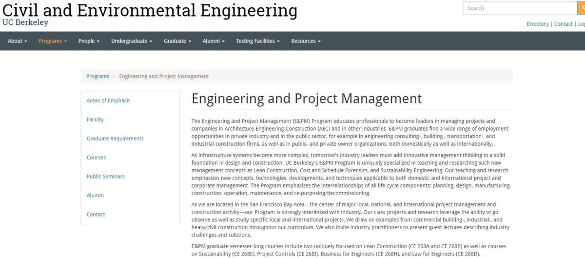 The UC Berkeley's Masters in Engineering and Project Management (E&PM) degree program prepares professionals to become leaders in managing projects and companies in Architecture-Engineering-Construction (AEC), as well as other industries. The program places emphasis on teaching and researching new management technologies, developments, techniques, and such concepts as Lean Construction, Cost and Schedule Forensics, and Sustainability Engineering. The Program emphasizes the interrelationships of all project life-cycle components: planning, design, manufacturing, construction, operation, maintenance, and re-purposing/decommissioning. The program is strongly interlinked with industry as the campus is located in the San Francisco Bay Area—the center of major local, national, and international project…