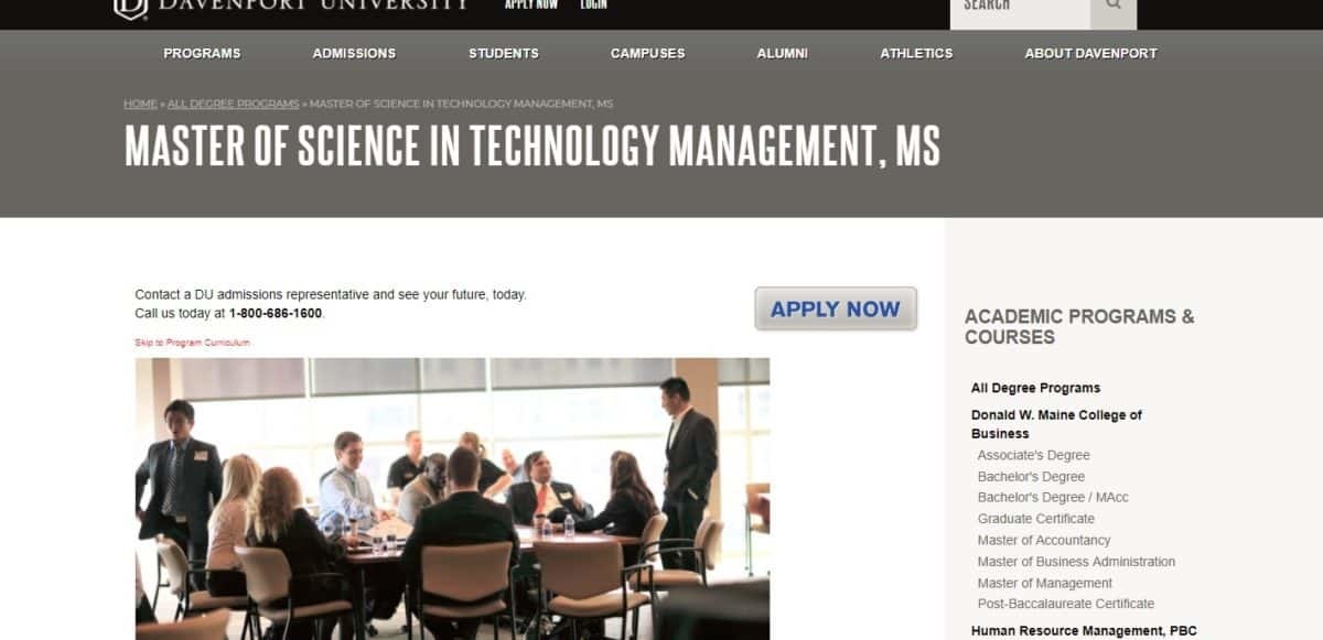 The Davenport University’s Master of Science in Technology Management program features a high quality, interdisciplinary technical curriculum designed to teach you to use appropriate tools, methods and applications, to manage and execute successful projects.