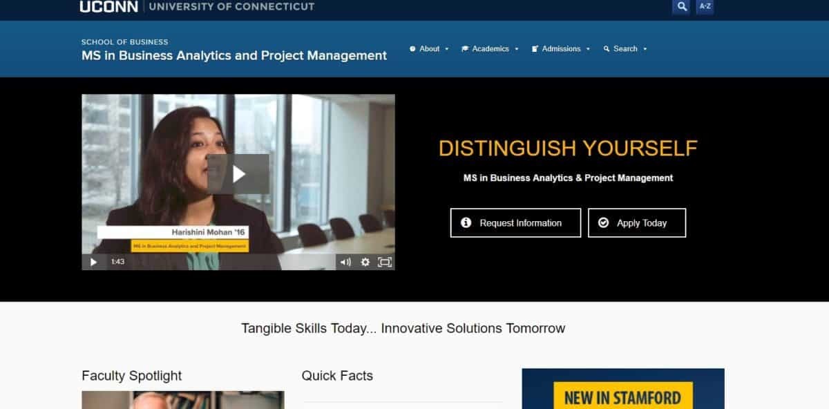 The University of Connecticut’s MS in Business Analytics & Project Management degree provides you with the project management knowledge, tools, and techniques you need to effectively plan, organize, and complete a project within scope, time and budget constraints.