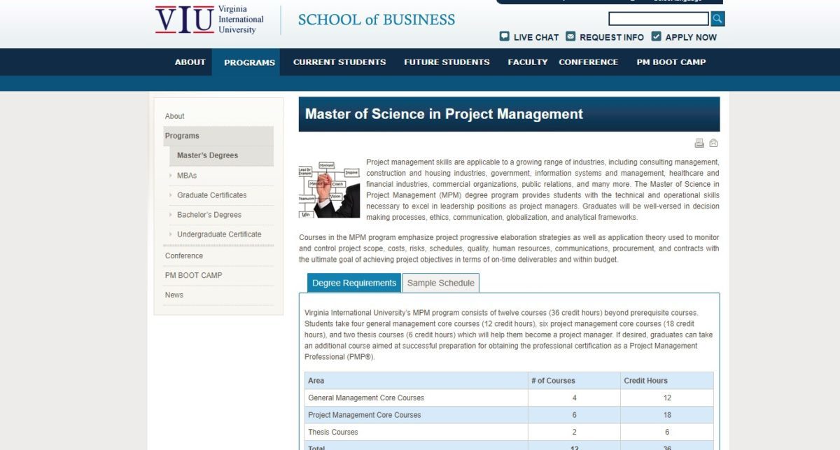 The Master of Science in Project Management (MPM) degree program offered by the School of Business at Virginia International University imparts the technical and operational skills required to integrate people, processes, and technology, so as to deliver a project both on time and within budget.