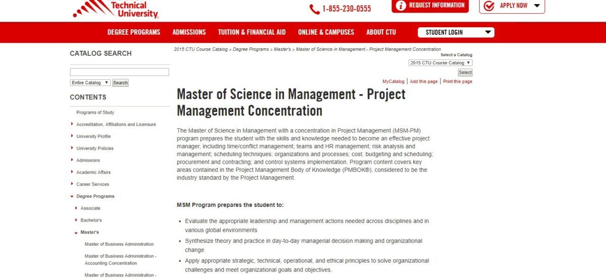 The Colorado Technical University’s Master of Science in Management with a concentration in Project Management (MSM-PM) program will provide you with the skills and knowledge needed to evaluate and implement appropriate leadership and management actions in a project management environment.