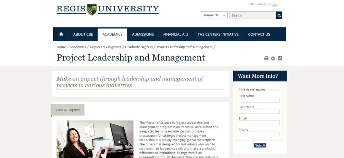 The Regis University’s Master of Science in Project Leadership and Management program is designed for professionals who wish to enhance their leadership and managerial skills, tools and techniques needed to manage projects in a variety of industries and settings.