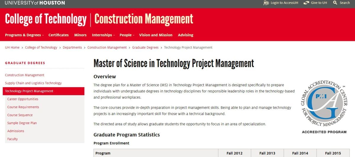 The University of Houston’s Master of Science in Technology Project Management features advanced graduate coursework in project management, which prepares students for responsible leadership roles in technology-based professional workplaces.