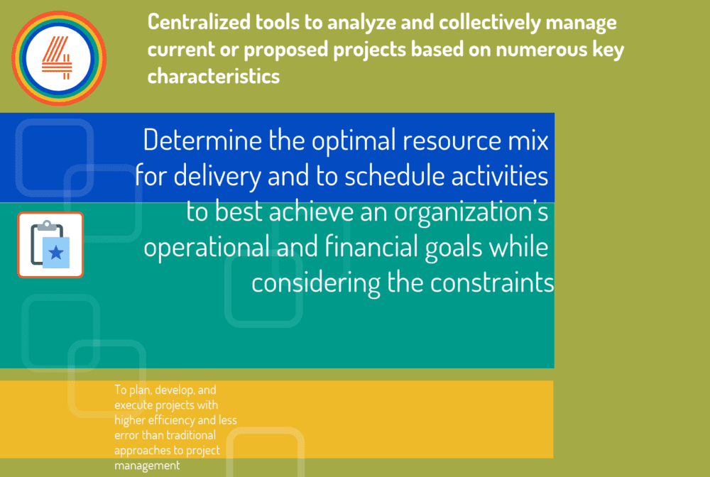 Project Portfolio Management Software are centralized tools to analyze and collectively manage current or proposed projects based on numerous key characteristics. The objectives of PPM are to determine the optimal resource mix for delivery and to schedule activities to best achieve an organization’s operational and financial goals while considering the constraints.