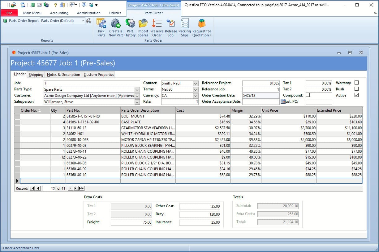 Total ETO’s CRM capabilities allows all departments to view and add to client activities, conversations, personal notes and documents. Total ETO provides users with the key information and tools to create quotations with greater accuracy. Spares and Parts orders can be created without involving engineers as users can lookup pertinent data and historical jobs with ease.