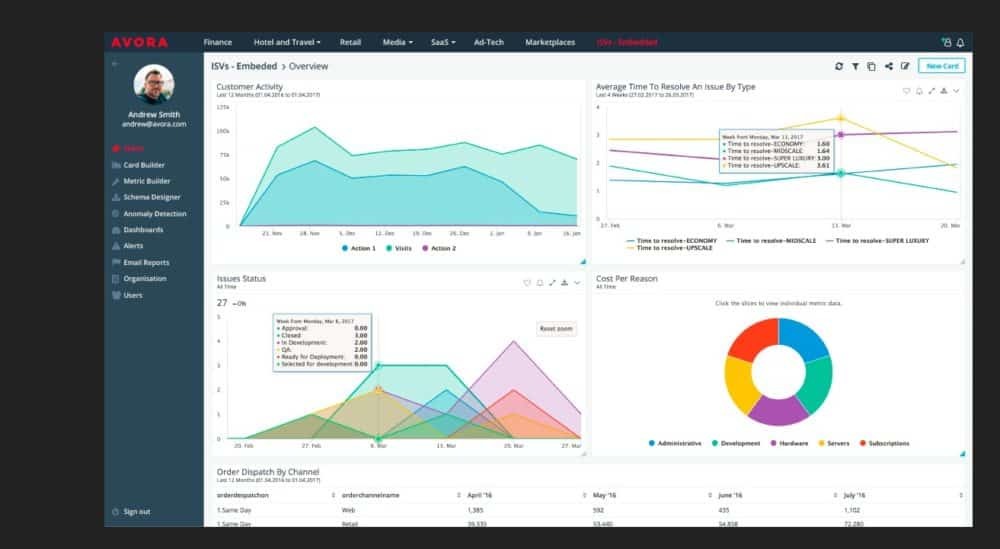 Avora has the features users need to manage their business such as the smart alerts which intelligently alerts users through browser email and mobile, slice and dice to quickly slice and dice the users’ data however they wish, anomaly detection which provides a 24/7 monitoring of the users’ KPIs across all of their data, card builder to let anyone build the most complex reports with Avora’s intuitive interface, sharing which enables users to work with their colleagues or share with suppliers, embedding to easily embed the users’ insights in to their applications, reports which has 1 click snapshots to email, excel, pdf or Powerpoint, mobile to easily access to real-time data and alerts while the users are on the go, an API to export the data as the users need it, providing over 300 integrations to choose from, TrueTag to enrich the users’ customer data with a website or an app event tracking and a TrueDM with no data modelling necessary.