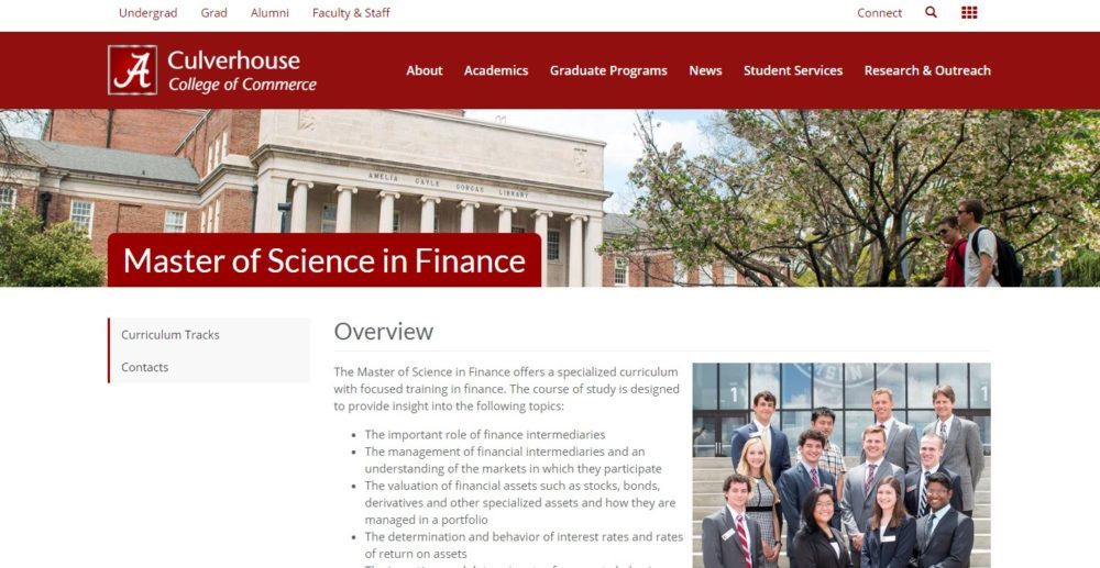 The Master of Science in Finance offers a specialized curriculum with focused training in finance. The course of study is designed to provide insight into the following topics: The important role of finance intermediaries, The management of financial intermediaries and an understanding of the markets in which they participate. The valuation of financial assets such as stocks, bonds, derivatives and other specialized assets and how they are managed in a portfolio. The determination and behavior of interest rates and rates of return on assets. The incentives and determinants of corporate behavior. The degree is designed to offer advanced, applied and theoretical experience in investment banking, corporate finance and/or financial derivatives. The University of Alabama is recognized through the CFA Institute. As a student in the MS in Finance program, you will have the opportunity to co-manage more than $50 million in assets held in equity and fixed income portfolios. Working as a team with other Wisconsin MS and MBA students, you will define an investment philosophy and process to guide your investment decisions. Using the same tools as those used by professionals, you will have complete authority to direct assets into investments you choose. Your clients are the University of Wisconsin System and the advisory board for the Hawk Center for Investment Analysis, respectively, for the fixed income and equity portfolios.