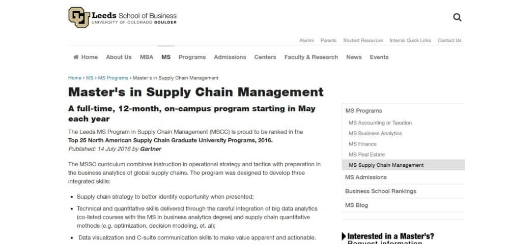 The Colorado University Master of Science in Supply Chain Management C curriculum combines instruction in operational strategy and tactics with preparation in the business analytics of global supply chains.
