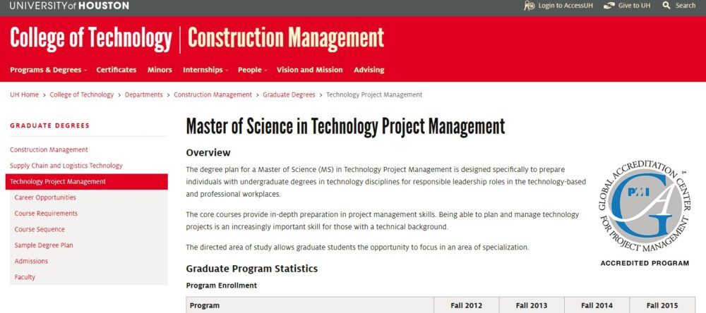 The University of Houston’s Master of Science in Technology Project Management is designed specifically to prepare individuals with undergraduate degrees in technology disciplines for responsible leadership roles in technology-based professional workplaces.