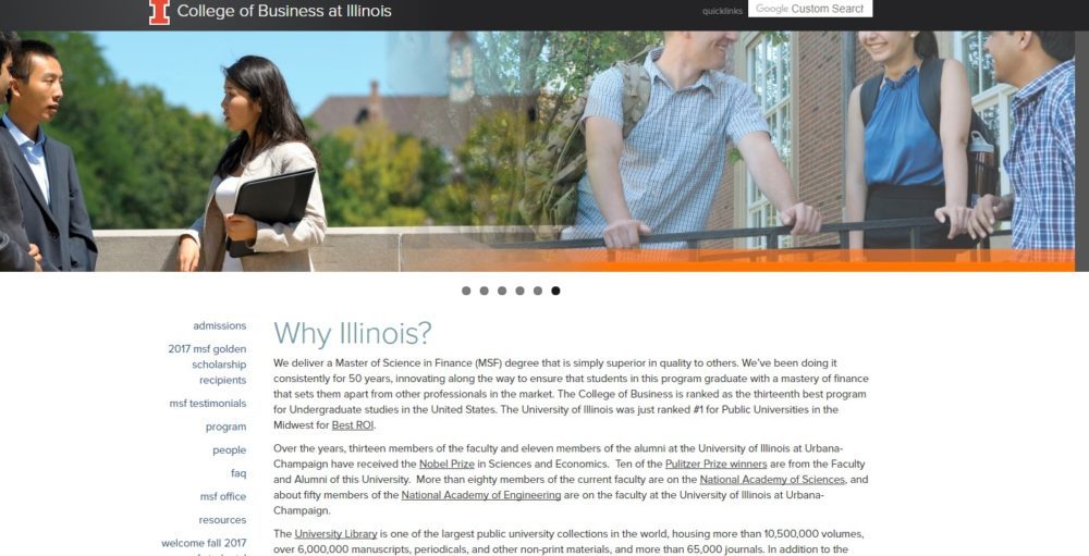 College of Business Illinois master of science in Finance Master program is renowned for bringing the market’s most essential models and theories into a virtual classroom. Online learners work with industry experts remotely to construct an indestructible foundation in financial analysis. Concentrations are available in Alternate Investments, Corporate Finance, Entrepreneurial Finance, Financial Econometrics, Financial Engineering, Financial Programming, High Frequency Trading, Investment Management, Risk Management, or Trading. Over the years, thirteen members of the faculty and eleven members of the alumni at the University of Illinois at Urbana-Champaign have received the Nobel Prize in Sciences and Economics. Ten of the Pulitzer Prize winners are from the Faculty and Alumni of this University. More than eighty members of the current faculty are on the National Academy of Sciences, and about fifty members of the National Academy of Engineering are on the faculty at the University of Illinois at Urbana-Champaign. The University Library is one of the largest public university collections in the world, housing more than 10,500,000 volumes, over 6,000,000 manuscripts, periodicals, and other non-print materials, and more than 65,000 journals. In addition to the main library, there are more than 37 departmental libraries and divisions throughout campus, including the largest U.S. engineering library, state-of-the-art agricultural library, and the world-renowned Rare Book and Manuscript Library. Immerse yourself in emerging concepts, practices and technologies necessary to be successful in today’s finance industry.