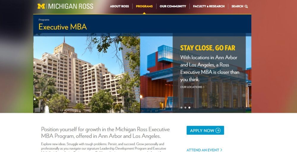 The Executive MBA offered by the Stephen M. Ross School of Business at the University of Michigan helps you grow both personally and professionally through a rigorous core curriculum, a Leadership Development program and an Executive Multidisciplinary Action Project course.