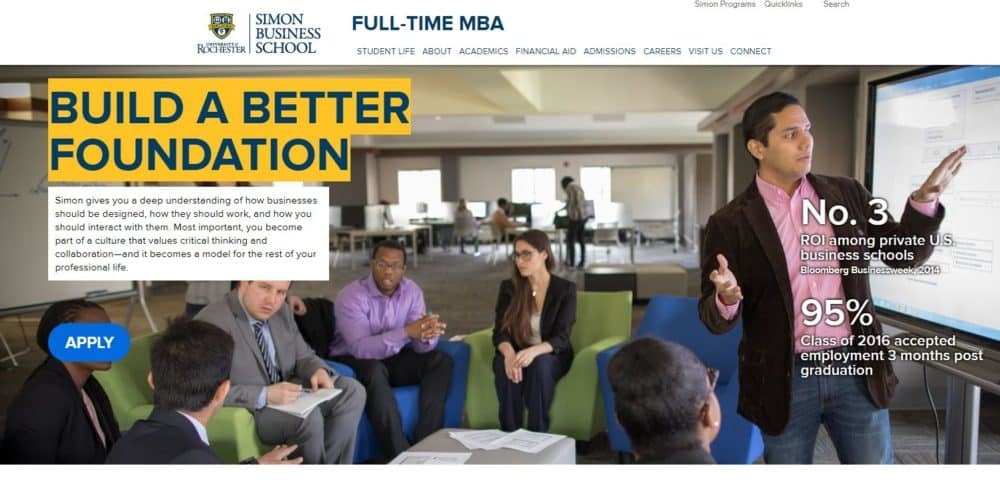 The University of Rochester Full-time MBA program’s curriculum integrates analytics-based academics with hands-on learning experience to impart a comprehensive skill set that gives graduates a competitive edge in the modern marketplace. The Simon Business School is renowned for its in quantitative, economics-based education founded on tradition and innovation. Its signature Frame, Analyze, and Communicate (FACt) model has been integrated in the curriculum and models you to be a sound decision-maker and empowers you to positively impact any organization. The program’s courses are designed to provide you with the tools to understand, explain, and predict business behaviors, so you can keep pace with today’s global business marketplace. The program maintains a balance between expert instruction and practical hands-on learning experience, and is taught by professors and instructors who are leading thinkers in their fields. During the first year, you study 11 core courses and a communication sequence that form the basis of your MBA experience and give you a general approach to business. The core curriculum highlights all aspects of business including finance and economics, marketing, management, communication, and analysis. You also participate in a consulting project that lasts two terms. In the second year, you are allowed to choose electives that let you customize your curriculum based on your preferred concentration track and also enhance your MBA experience. You also take part in Internships and global study tours that involve some of the world’s most innovative companies. The Simon MBA curriculum also allows you to gain hands-on experience through experiential learning courses such as the brand management workshop, strategy and business consulting practicum, cases in finance, brand strategy, and more. The career center helps students chart their own career through résumé development, mock interviews, and career counseling, giving them a competitive edge in the job market.