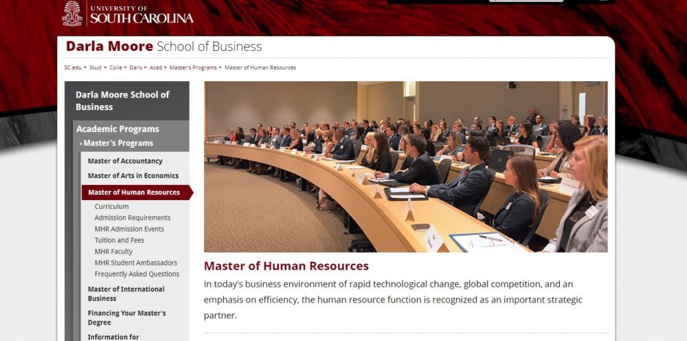 Master of Human Resource is a world-class program offered at the Darla Moore School of Business. The program aims to bring out exemplary HR professionals with diverse skills to curb challenges in this profession. A comprehensive curriculum and practicum has been put in place to give both conventional and unique skills in line with the technological changes and the high competition in this profession. Master of HR gives its students 45-credits to be completed within sixteen months; Human Resources Core (27 credits), Human Resources internship (6 credits) Business Foundation Electives (12 credits). This program ensures adept HR persons with the detailed learning related to HR professions such as management of compensation, Labor relations, Human resource metrics and research methods. Knowledge of financial policies as well as Business strategy is inculcated in the curriculum. The program embraces changes in today’s workplace hence combine both traditional and digital strategies, giving its students added advantage in the fast-changing world. The students are thoroughly trained by proficient lecturers. In addition, the eight to twelve week internship gives the students first -hand experience and exposure in the chosen field. Skills are learnt as all theory learnt in class is put into practice. The internships are provided by the school to ensure hands on the ground experience for its students. The students are also equipped with diverse knowledge from different expert speakers invited by the school, relevant to their profession. The Darla Moore School of Business also offers high placement rates with a median salary of $80,000, having partnered with Fortune 500 companies such as Emory Advisory Board.